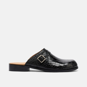 Crafted from rich, distressed cow leather, this modern mule sits atop a full calfskin leather lining, giving the classic slip-on a distinctly refined feel. Elevated by the subtle antique brass buckle, these are the definition of easy luxury.