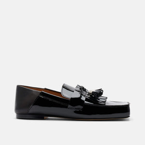 These black patent square toe loafers with woven raffia detail are serving polished sophistication with a laid-back twist. The tassel finish adds flair while the back heel can be folded down to be worn as a mule.