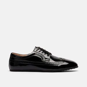 High-gloss and razor sharp, this black patent longwing turns tradition into after-hours elegance. Classic brogue detailing grounds it, while the lacquered finish and lean, ballerina-inspired profile keep it sleek and modern. Thin rubber soles keep it light, and cushioned insoles carry you comfortably past last call.