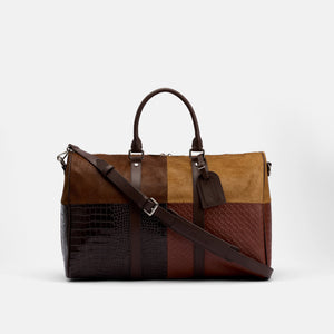 Bold, distinctive, and effortlessly refined, this multicolor duffle is a true statement in craftsmanship and character. Expertly constructed from a rich blend of premium materials—including crocodile embossed leather, woven leather, and cowhide—it delivers a striking contrast of patterns and warm brown hues that elevate any travel ensemble. Its durability gets a serious upgrade from premium metal hardware, complete with an adjustable strap featuring a removable shoulder pad for comfort. Two secure top handles allow for easy grab-and-go travel, while thoughtfully designed interior pockets keep your smaller necessities perfectly arranged and accessible.