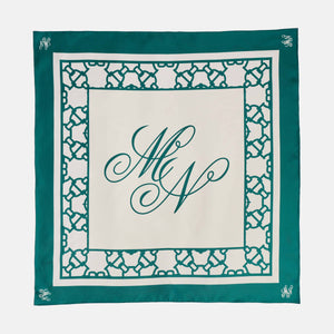 Soft cream pairs with vibrant green in a 100% mulberry silk scarf that exudes easy self-assurance. With a subtle chainlink pattern and monogram initials, this is a scarf that’s at home everywhere from the country club to the jazz club. Tie it on a handbag or messenger bag for a flourish of eye-catching cool.